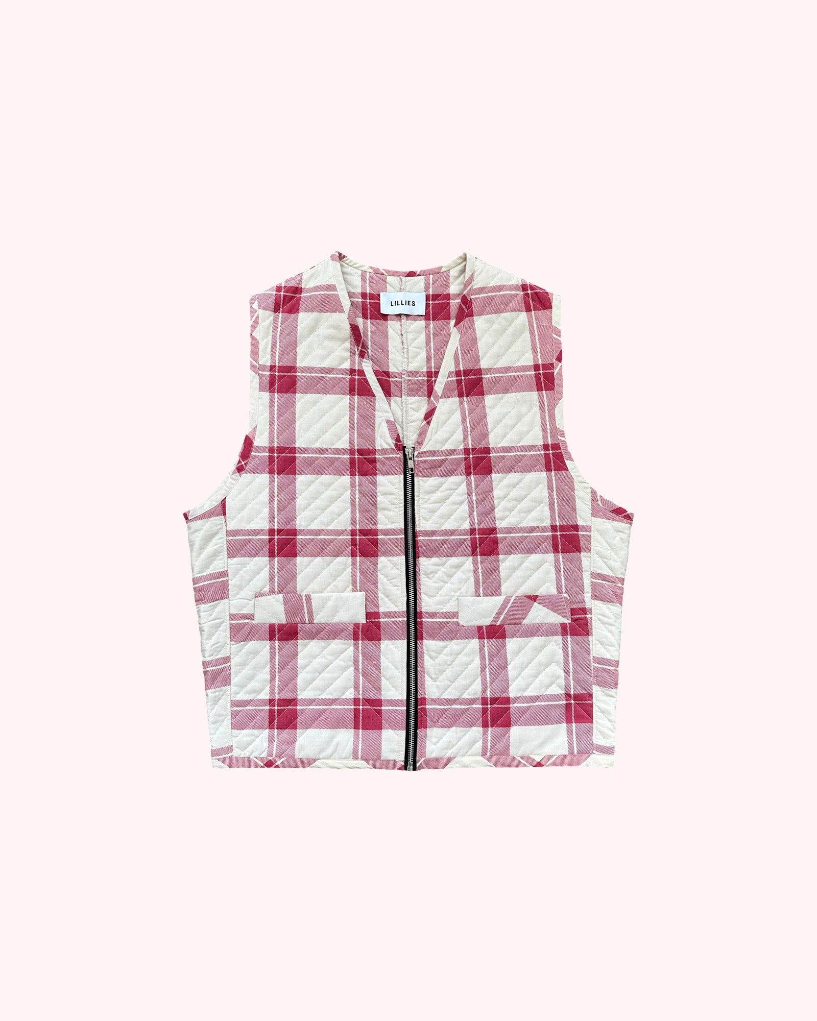 The Grandmother vest had been using my childhood blankets. Created using up-cycled fabric made by hand using sustainable materials. Each vest is one-of-a-kind piece, maximising fabric use age to reduce waste.