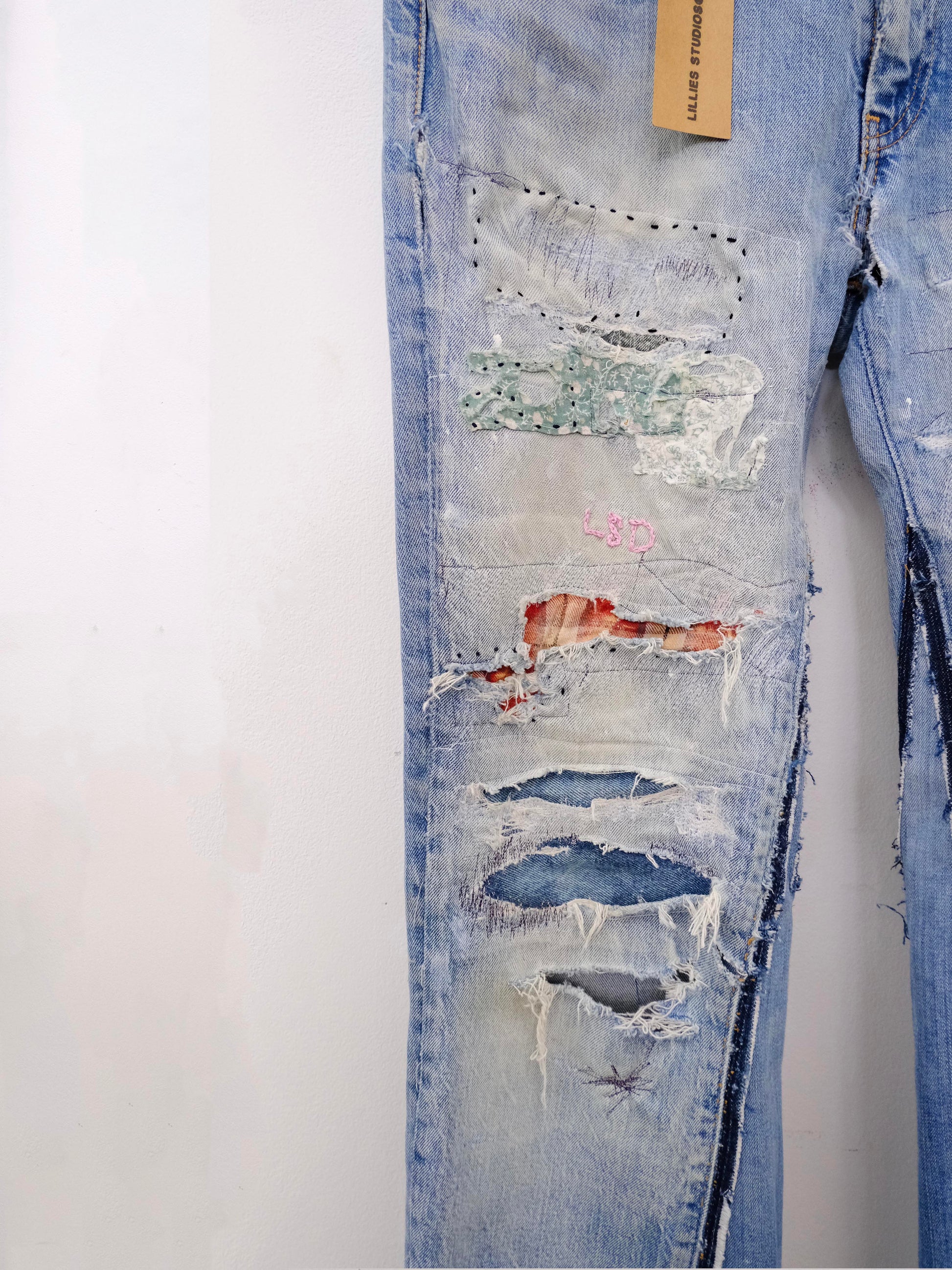 These jeans are handmade from vintage denim, reworked using various reclaimed denim and fabric patches.