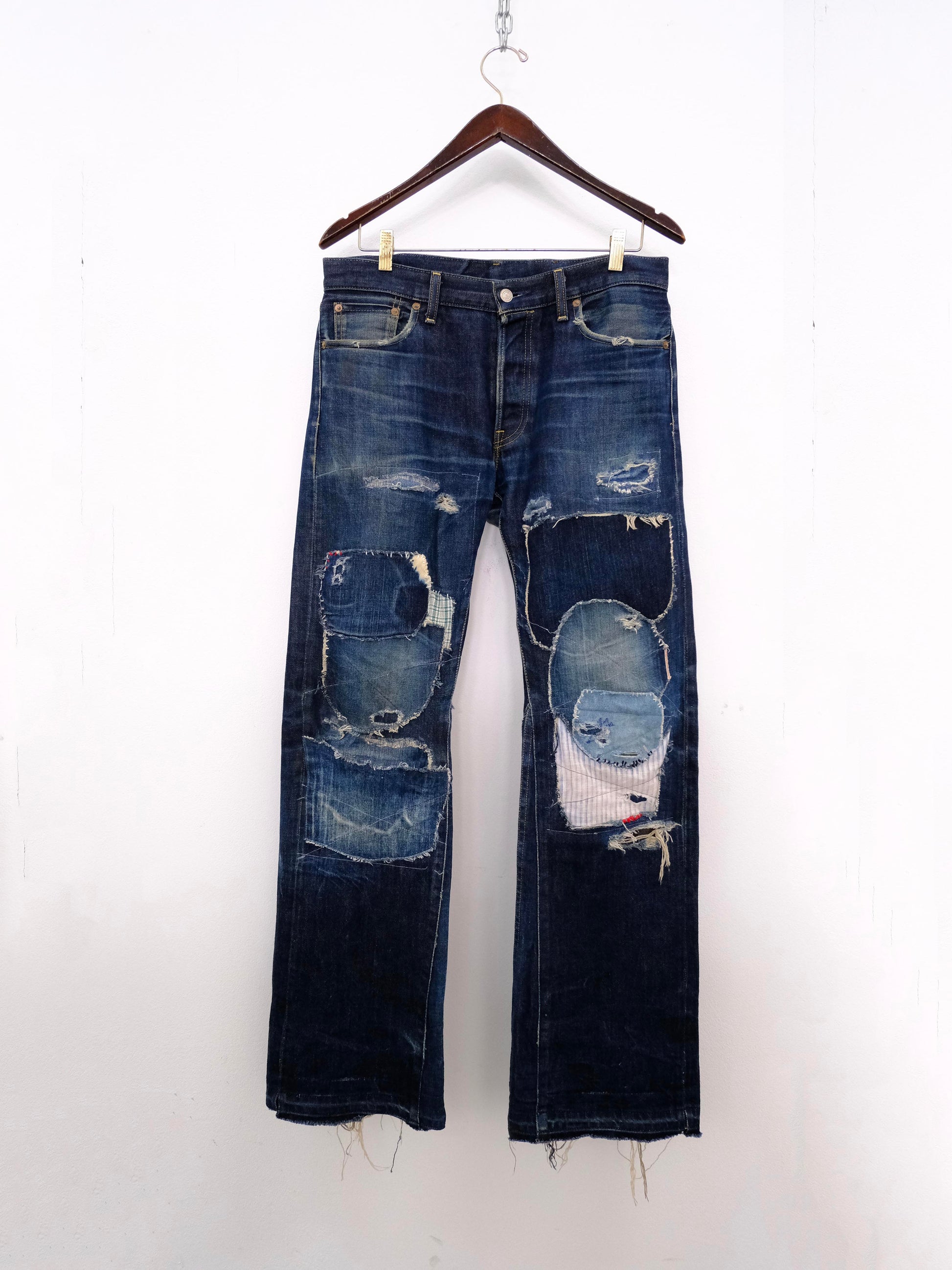 These jeans are made with vintage Japanese Selvedge denim, reworked using various reclaimed denim and fabric patches.