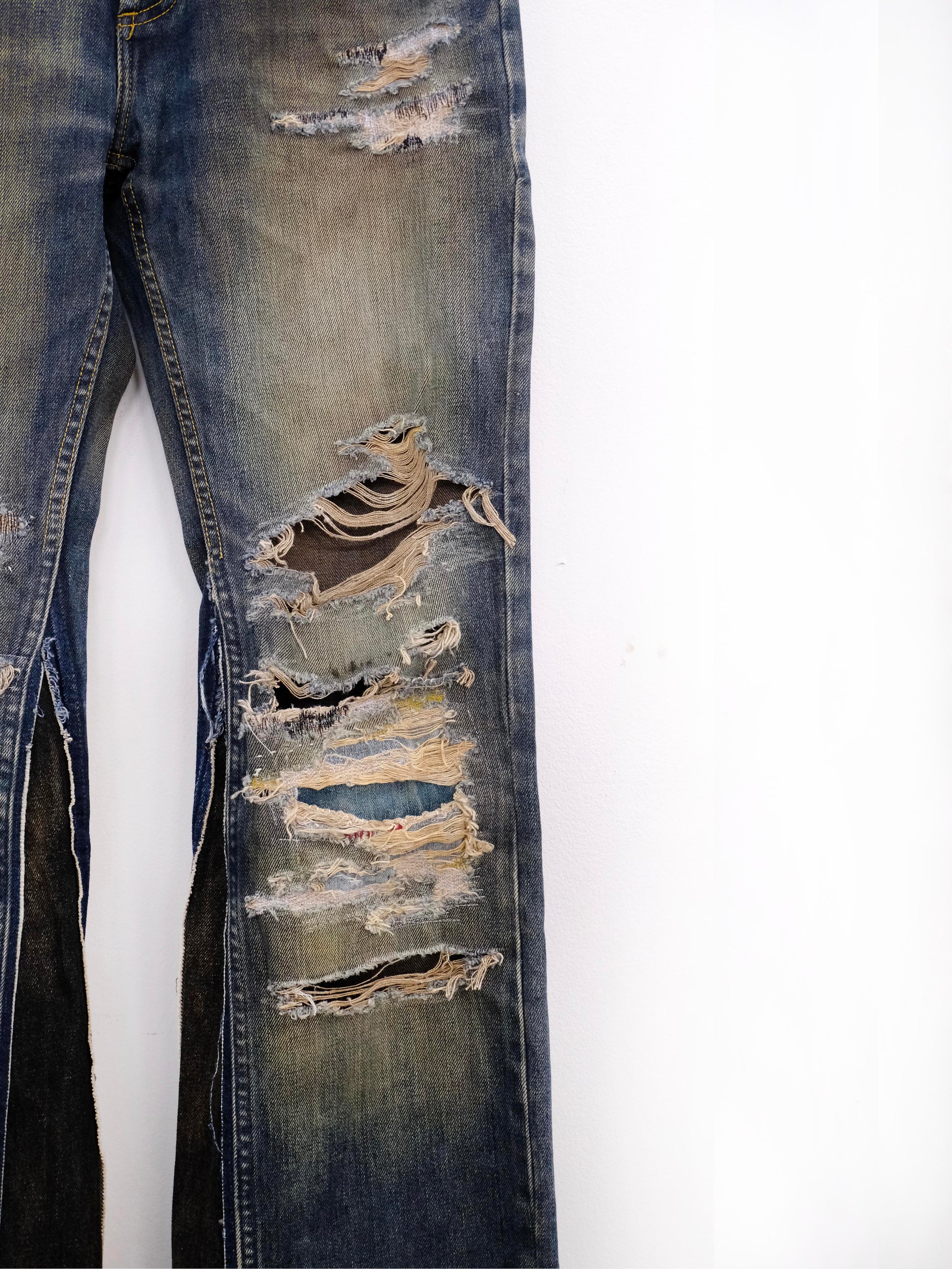 These jeans inspired by Japanese patchwork denim jeans created using vintage Jeans, reworked using various reclaimed denim and fabric patches.